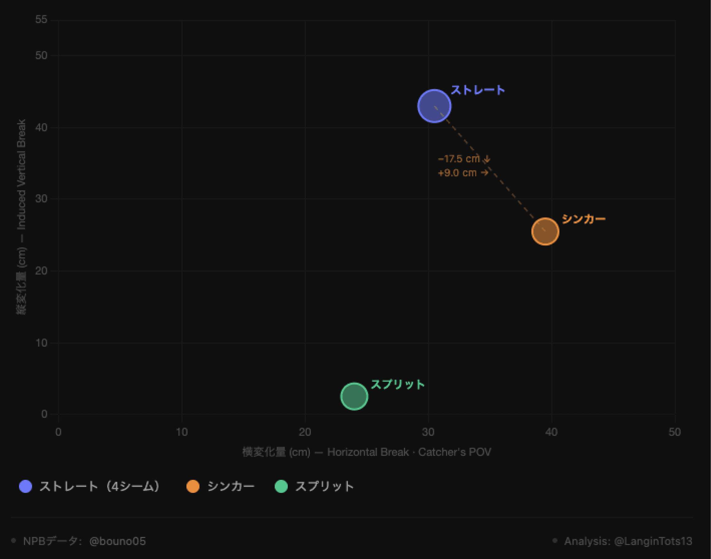 NPBの左打者はスプリット以外の変化球に対してほとんど空振りしない。このジャイロは、この球速とニアゼロブレイクにおいて、その数少ない例外の一つだ。[NPBの左打者の被空振り率の詳細は今井の分析を参照。] これまでスプリットが左打者への三振の主力だった。もう一つの有効な武器を加えることは贅沢ではなかった。投球構成に最も欠けていたものだ。