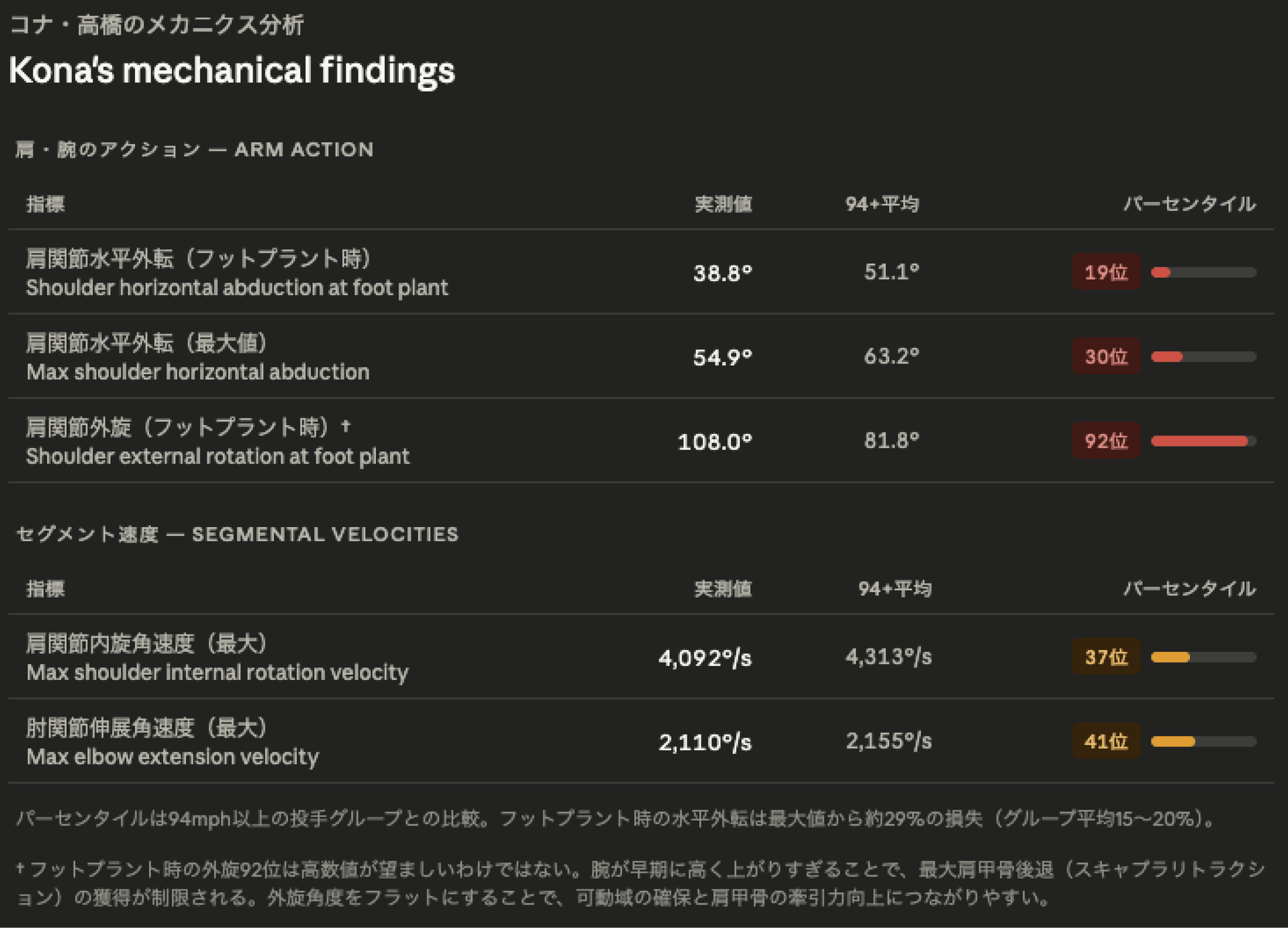 フットプラント時の肩外旋角度は108°で、94mph以上グループの92パーセンタイルに位置する——このコンテキストではポジティブではない。数値が高いほど、腕が平均より早く高く上がっていることを意味する。パンチを打つ前に腕を引くことを考えると、フラットな初期テイクアウェイの方が可動域全体を通じて加速する余地が生まれる。フットプラント時にすでに高く外旋した腕はそのストレッチを築く余地が少ない。