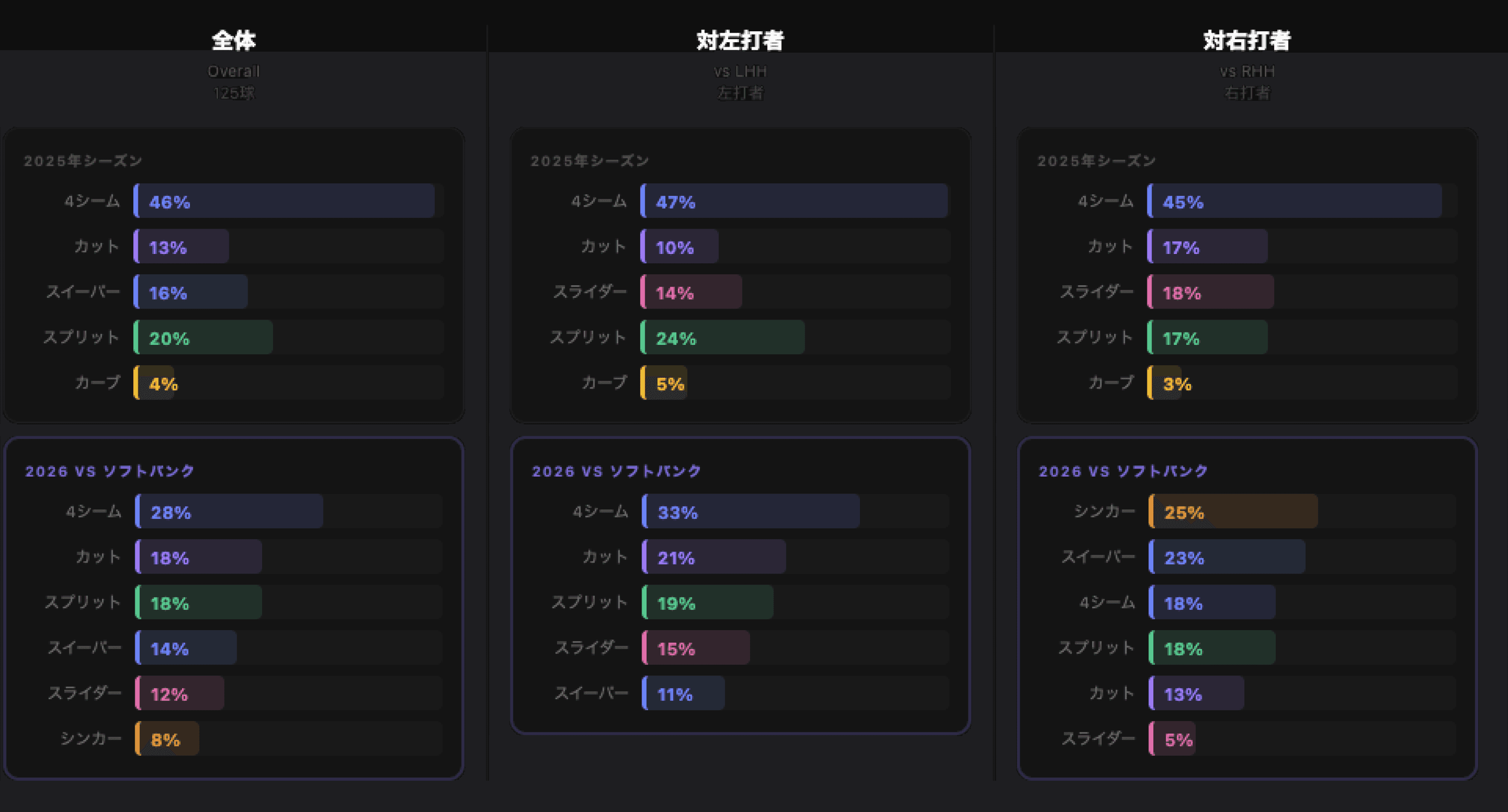 福岡ソフトバンクホークス戦、その夜の最も遅い4シームは150km/h。125球を投げ平均152.5km/h——1試合を通じての自己最速だ。11奪三振、2安打、0失点、1四球。6球種を駆使し、最多使用でも28%を超えず、最少使用でも8%を下回らなかった。利き手別に分解するとそのバランスはさらに際立つ。全体では最も使用頻度の低かったシンカーが、右打者に対しては最多の25%だった。