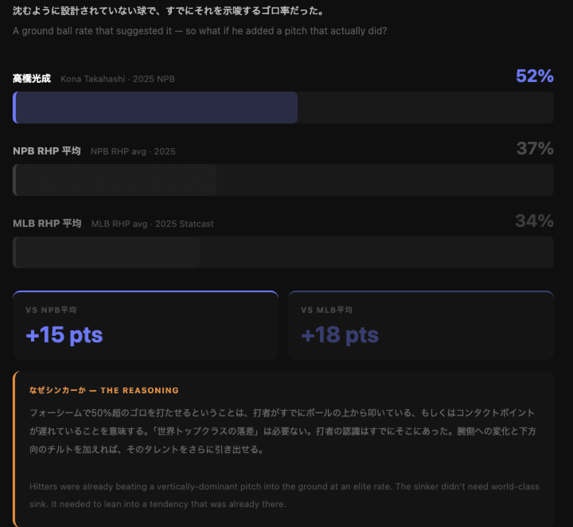 高橋の成績と投手としての特性を評価する中で、一つの数字が目に留まった。4シームのゴロ率が2シーズン連続して50%を超えていた。通常、ゴロ率は4シームのパフォーマンスを左右する主要な要素ではない。この球はそのために設計されていない。しかしその数値の大きさは無視できず、何かを示唆していた。縦方向に強い球でこれだけのゴロが出るということは、打者がすでにボールの上から叩いているか、コンタクトポイントが遅れていることを意味する。その傾向が本物であれば、実際に沈むように設計された球を加えたとき何が起きるかという問いに自然とつながる。
