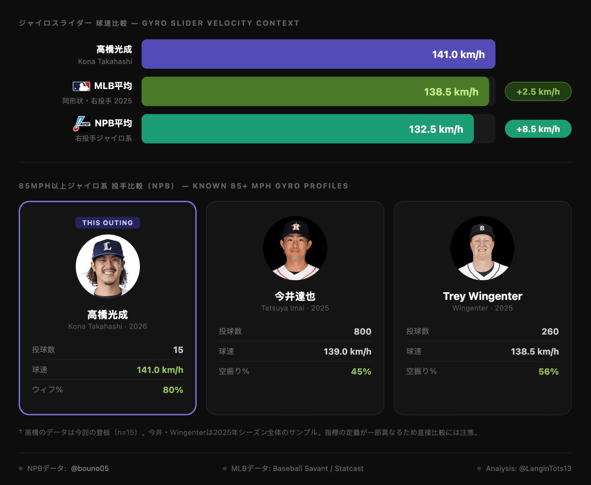 別の角度から見ると:2025年シーズンの同形状のMLB右投手スターターと比較して、高橋のジャイロは平均より2.5km/h速い。NPBとの差はさらに大きい。MLB基準でも即戦力級だが、NPBにおける球速の分離は別次元だ。今井と佐々木(現MLB)がリーグを去った今、同等の球は存在しない。この希少性は努力の結晶であり、リーグの常識を超えたプロファイルを開発した高橋の功績だ。