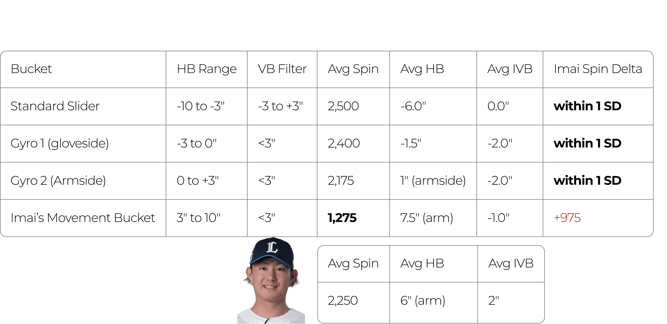 The movement bucket averages tell the full story. Imai's slider sits within one standard deviation of the sweep, tight glove, and near arm-side buckets by spin rate. His spin profile belongs with sliders. His horizontal break lands in a movement zone where the average pitch spins at 1,275 rpm. He is +975 rpm above the mean of the movement bucket his ball actually arrives in.