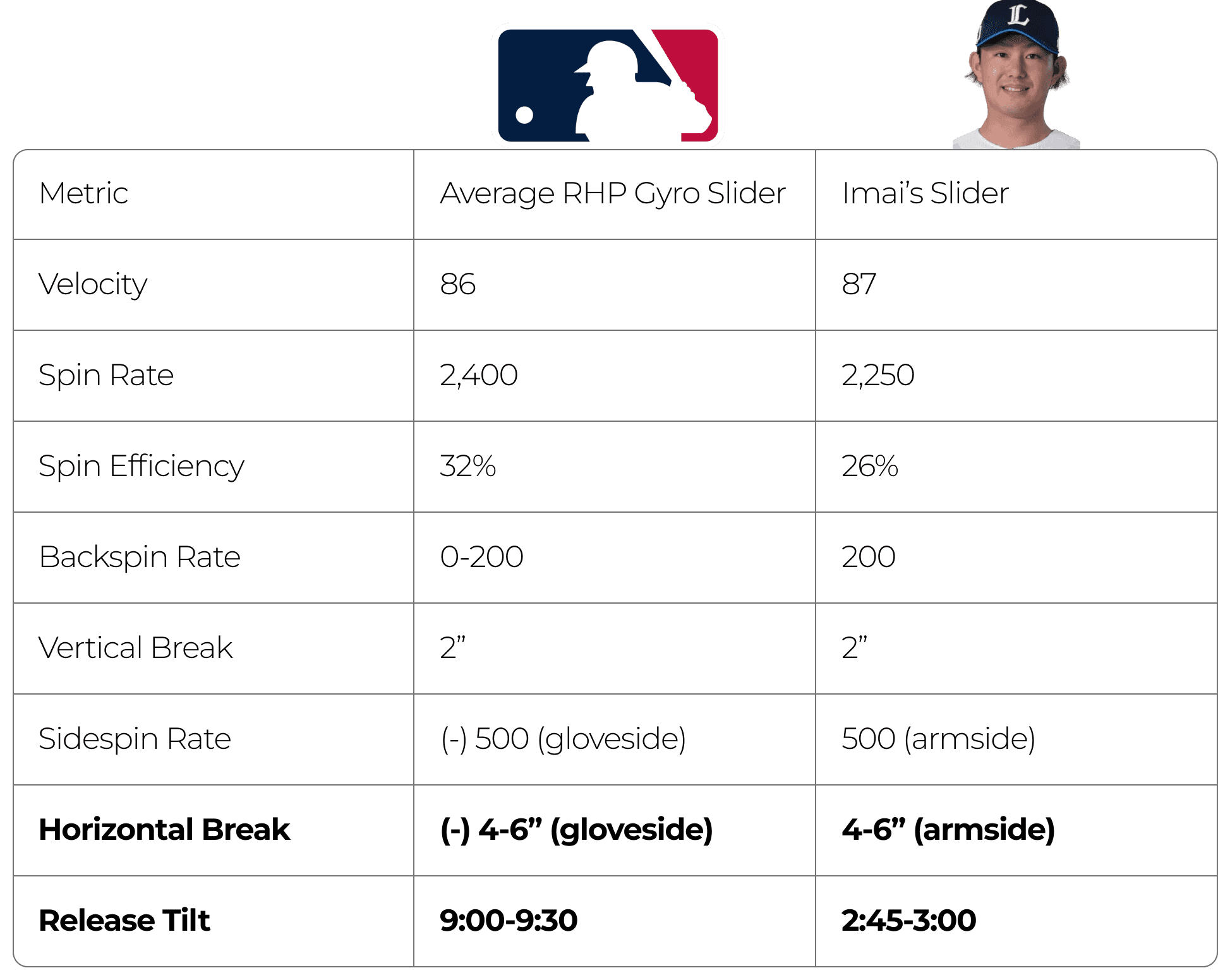 Imai puts roughly 500 rpm of armside spin on the pitch and a trace of backspin. Pure bullet spin on the ball vertically. Same as a conventional slider. Slider spin rate. Slider efficiency. Slider release tilt.