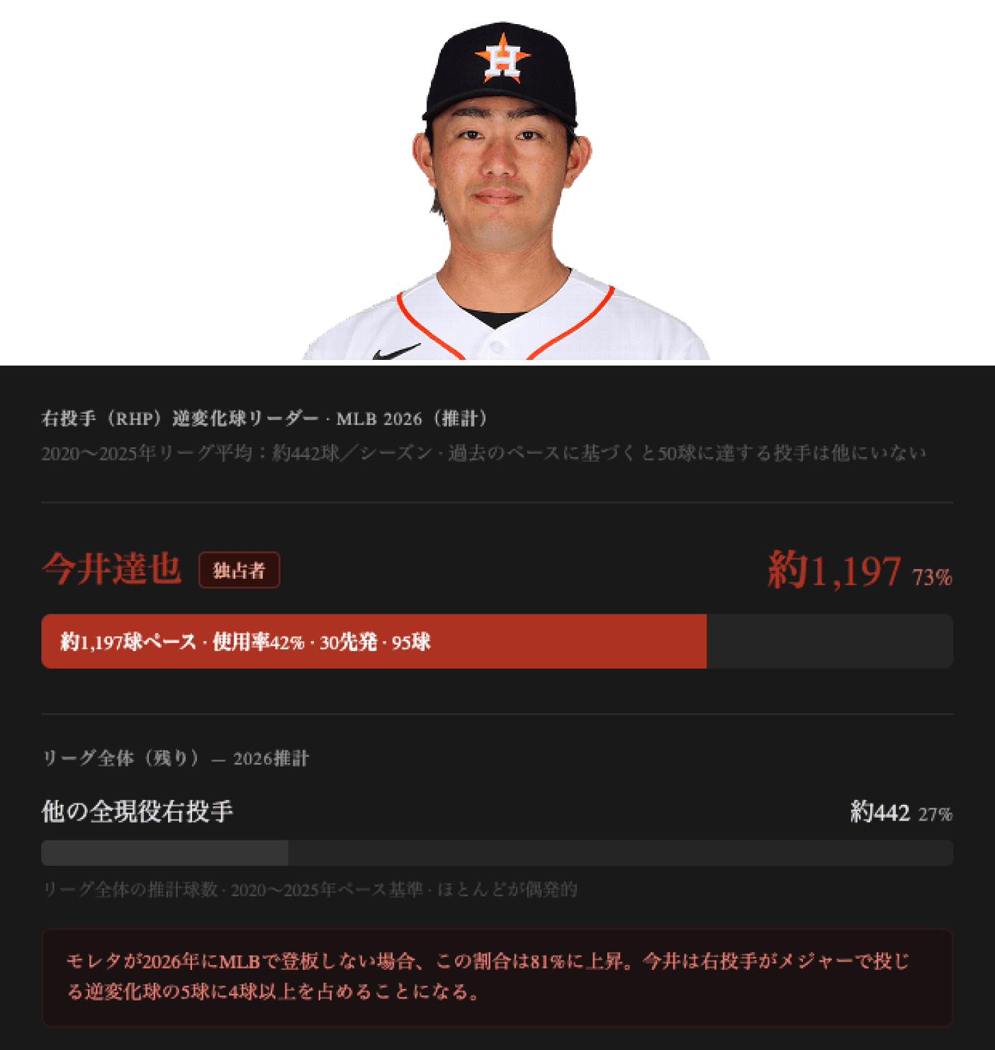 2026年、現在のペースで推計すると、今井はフルシーズンでこのピッチを約1,197球投げると予測される。現役MLB右投手全員合計――2020〜2025年のリーグ全体の年間平均約442球に基づく――が残りを投げる。そのほぼすべては偶然だ。今井は2026年シーズンに投げられるRHPアーム側ジャイロ変化球全体の73%を占める。モレタがMLBに復帰しなければ、その数字は81%まで上昇する。