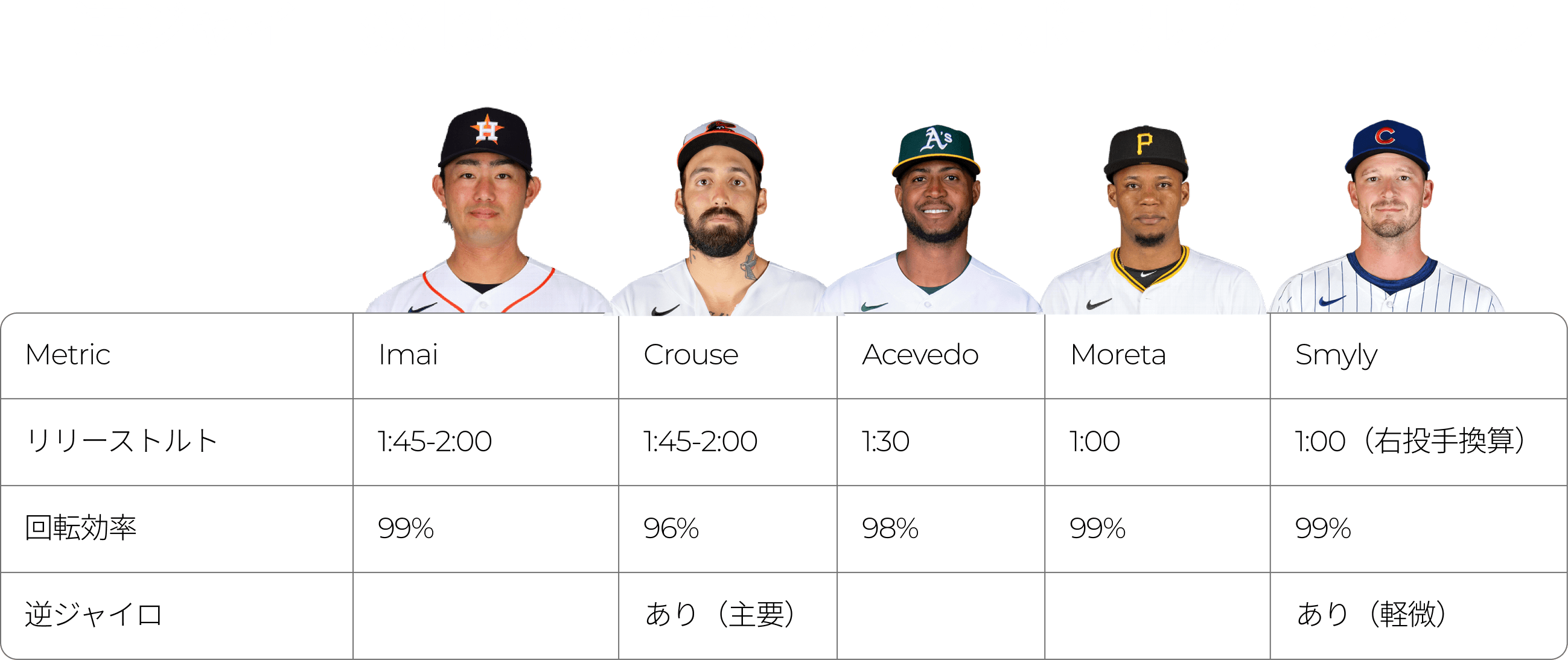 このバケットで確認されている投手たちは、変化量データだけでは直ちに明らかにならない共通点を持っている。彼らはほぼ例外なく、高プロネーション投手だ――フォーシームのスピン効率が約100%に近いか、フォーシームのスピンをある程度逆転させている腕だ。今井、モレタ、アセベドは高効率側にいる。クラウスとスマイリーはより極端なものを代表する――一次球種のスピン効率が低いことは、従来の意味での弱点ではない。それはリリースを通じた顕著なプロネーションの産物であり、最初からアーム側ジャイロ変化球を可能にする同じメカニカルパターンだ。クラウスのシンカーやスマイリーのツーシームの低い効率数字は、従来のスピンを達成できていない投手ではない。スピン軸が期待されるものに対して逆転するほど多くのプロネーションをかけている投手だ。それは意味のある異なることだ。