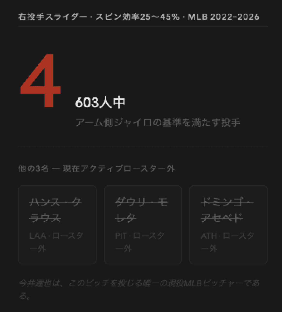 2026年のある週に、今井は他のすべてのMLB右投手を合わせたより多くの意図的なアーム側ジャイロ変化球を投げる。圧倒的な差で。ピッチタイプの多様化がかつてないほど高まり、30球団の集団的分析インフラが常にエッジを探し求め、効果的なピッチとは何かについての情報サイクルがかつてないほど速く動いているスポーツにおいて――一人の投手がピッチタイプをほぼ独占している。