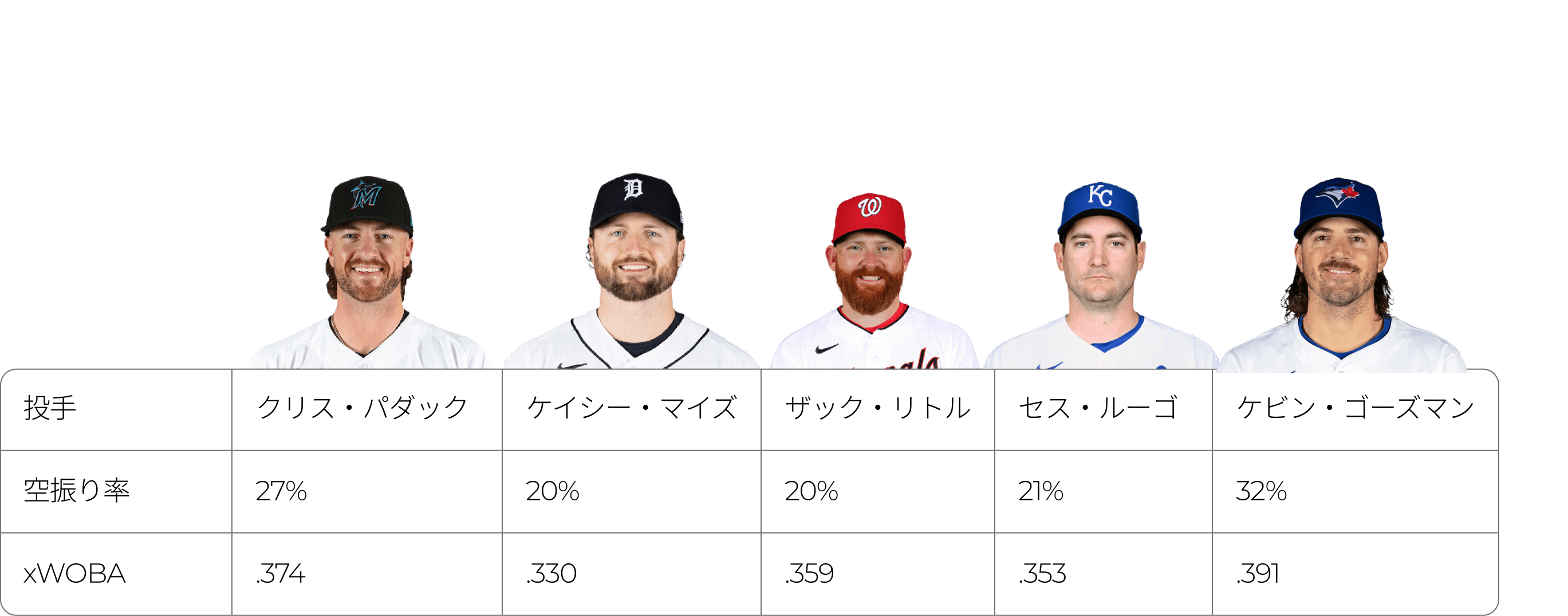 パダックとマイズが最も具体的に指摘したい2人だ。パダックは信頼できるブレイキングボールを持ったことがない――プロネーションプロファイルはあり、xWOBA .374と空振り率27%で現在のスライダーの結果は少なくとも会話する価値がある。マイズは分析的により興味深い:フォーシームのリリーストルトが1:02――確認されたアーム側ジャイロ投手であるモレタとほぼ同一だ。空振り率20%とxWOBA .330のスライダー867球は試合を失わせているピッチではないが、空振り奪取を具体的に求めているなら、プロネーションプロファイルはあり、インセンティブは緊急というより状況的だ。