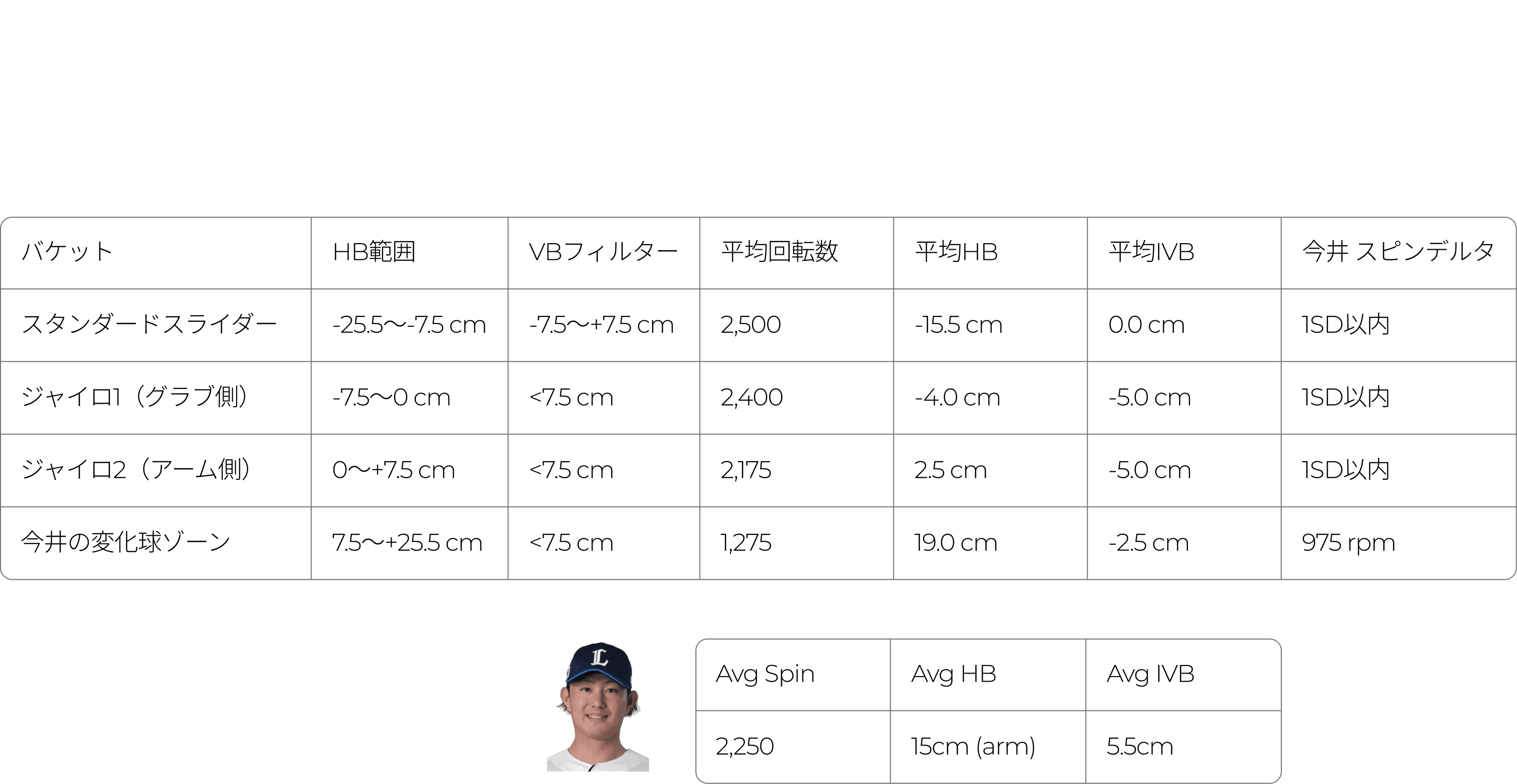 パート I で言及されている75%スピンアイデンティティの数字は、従来のスライダー母集団の平均に対する今井のスピン効率とアクティブスピンレートから導出されており、Statcastの直接出力ではない。