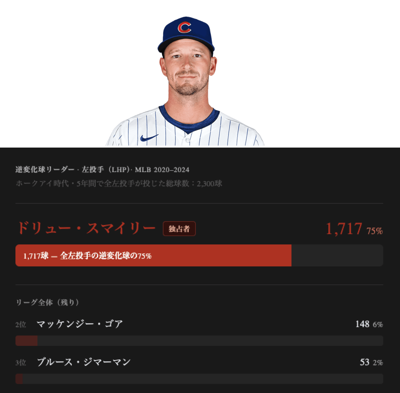 Hawkeye時代を、今井が現在占めているのと同じリバース変化球バケットでフィルタリングする――今度は左投手で。リーグ全体で5年間に投げられた2,300球。スマイリーはその1,717球を投げた。75%だ。