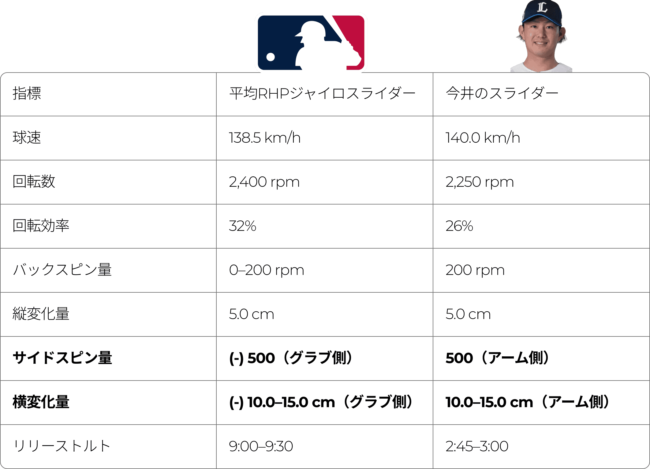 今井はこのピッチに約500 rpmのアーム側スピンをかけ、わずかなバックスピンを加えている。縦方向はほぼ純粋なバレットスピン。通常のスライダーと同じだ。スライダーの回転数。スライダーのスピン効率。スライダーのリリーストルト。